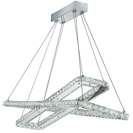 This Clover chrome LED double rectangle frame pendant with clear crystal trim looks absolutely stunning on the ceiling of any living space. The two chrome finish intertwining rectangles are adorned with crystal squares and they are fully adjustable so they can be positioned at different angles for distinctive lighting effects, adding a large touch of modern glamour to any room.