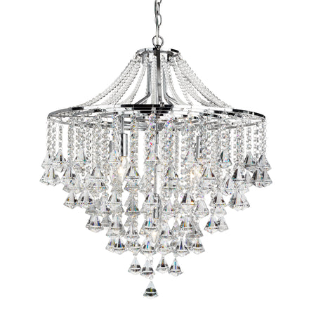 The Dorchester chrome 5 light chandelier is a stand out pendant which will create a stunning focal point in any home. With clear crystal drops and buttons it is unmistakably bold and stylish, adding a glamorous feel to any living space or entrance hallway. The pendant is adorned with chunky crystal buttons and drops, which refract the light beautifully, and the elaborate chrome finish fitting has cascading crystal beads, from the top of the fitting to the main frame. Height adjustable, this 5 light pendant can be adapted to suit the ceiling height of any home.