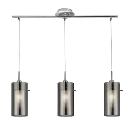 This Duo 2 chrome 3 light bar pendant with double glass cylinder shades looks modern and stylish on any dining room or kitchen ceiling, ideally positioned over a breakfast bar or dining table. The three glass shades feature a smoked glass outer and a frosted glass inner, which combine to create a graceful source of light. This striking fitting has a sleek chrome finish bar to support the lights and complete the look.