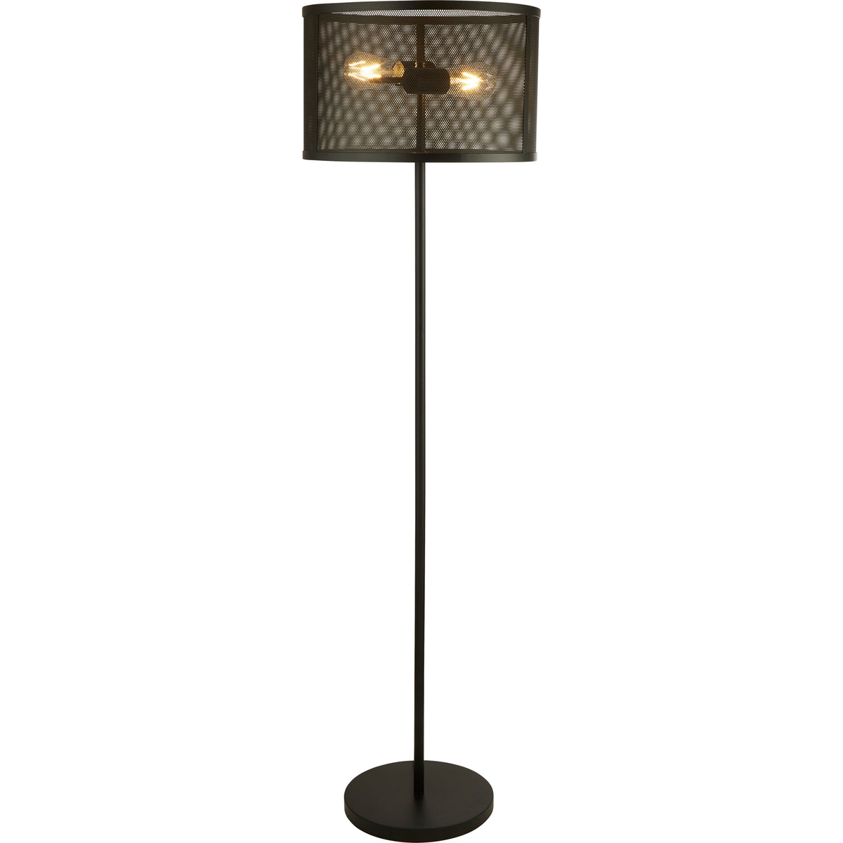 This stunning Fishnet matt black floor lamp encapsulants 2 lights within a beautiful ornate black mesh cage. The matt black shade is created using 2 curved perforated black panels, they house 2 light fittings positioned centrally. This contemporary fittings would work in a dining, kitchen or living room. For the perfect finish to any room combine it with a ceiling light from the same family.