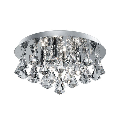 Add a dazzling effect to your bathroom using this striking Hanna flush fitting with clear pyramid crystal drops light in chrome. The four lights suspend from a chrome base and the crystal drops add a particularly elegant touch. Add as a centre piece to any sophisticated bathroom. This item has a rating of IP44, meaning that it is fully splash proof and suitable for use in a bathroom setting. LED's use up to 75% less energy and last up to 20 times longer than incandescent bulbs.