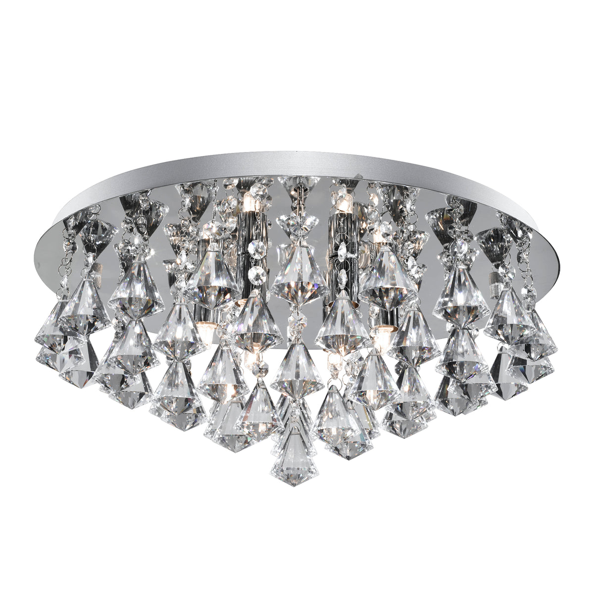 This Hanna chrome 6 light flush ceiling fitting with diamond shape crystals looks striking on any ceiling. The luxurious light fits flush to the ceiling and features six lamps surrounded by clear crystal trimmings, with diamond shaped droplets. And the elegant mirrored backplate completes the look of this modern chandelier.