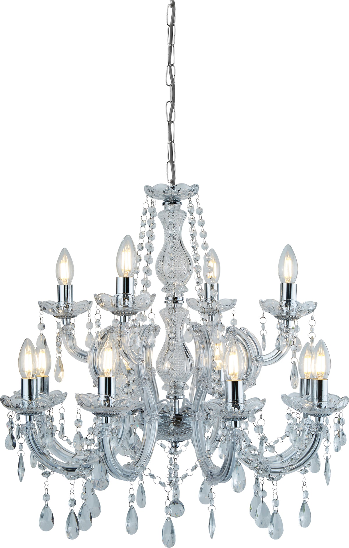 The spectacular, glittering Marie Therese 12 light chandelier with a polished chrome finish has an aristocratic style, perfect for adding a theatrical touch to any large room. A traditional design with a modern twist, this ceiling light is luxuriously adorned with acrylic drops, barley twist arms and glass trimmings that creates a glamorous, picturesque focal point when illuminated.