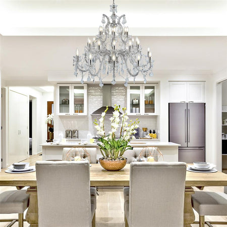 The spectacular, glittering Marie Therese 30 light chandelier with a polished chrome finish has an aristocratic style, perfect for adding a theatrical touch to any large room. A traditional design with a modern twist, this majestic ceiling light is luxuriously adorned with crystal drops, barley twist arms and glass trimmings that creates a glamorous, picturesque focal point when illuminated.