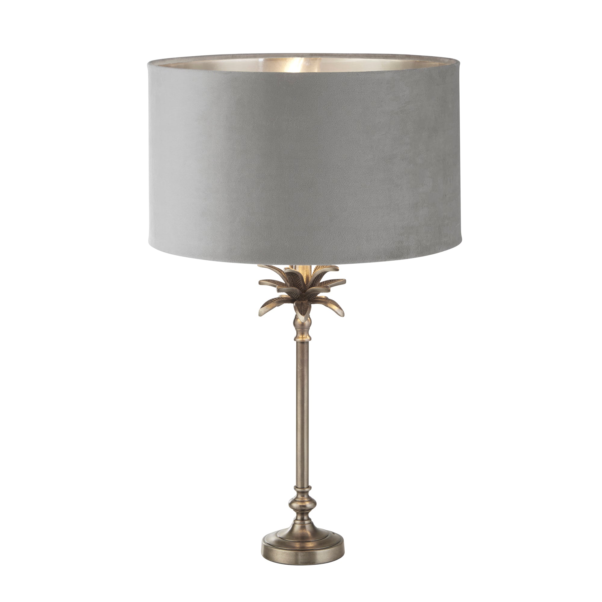 Antique Nickel Metal & Light Grey Velvet Shade with Silver Inner: The Palm Table Lamp is the perfect combination of style and function. This stunning lamp features a timeless design that seamlessly complements both traditional and more modern interiors. Crafted with high-quality materials, the lamp has an antique nickel base in the shape of a palm tree that adds a touch of elegance and sophistication to any room. The light grey and antique nickel colour scheme exudes warmth and richness, creating a captivating focal point in your space. This table lamp comes with a beautiful light grey velvet drum shade with a metallic silver inner, adding a luxurious and refined touch to the overall design, adding a soft glow to any living room or bedroom.