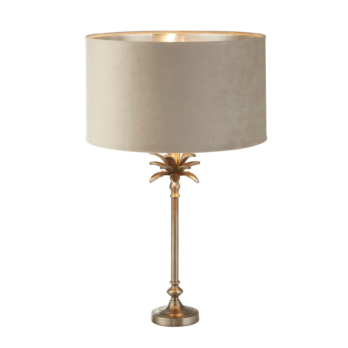 Antique Nickel Metal & Taupe Velvet Shade with Silver Inner: The Palm Table Lamp is the perfect combination of style and functionality. This stunning lamp features a timeless design that seamlessly complements both traditional and contemporary interiors. Crafted with high-quality materials, the lamp has an antique nickel baser in the shape of a palm tree that adds a touch of elegance and sophistication to any room. The taupe and antique nickel colour exudes warmth and richness, creating a captivating focal point in your space. The lamp comes with a beautiful taupe velvet shade with a metallic silver inner, adding a luxurious and refined touch to the overall design, creating an inviting ambiance in any living room or bedroom.
