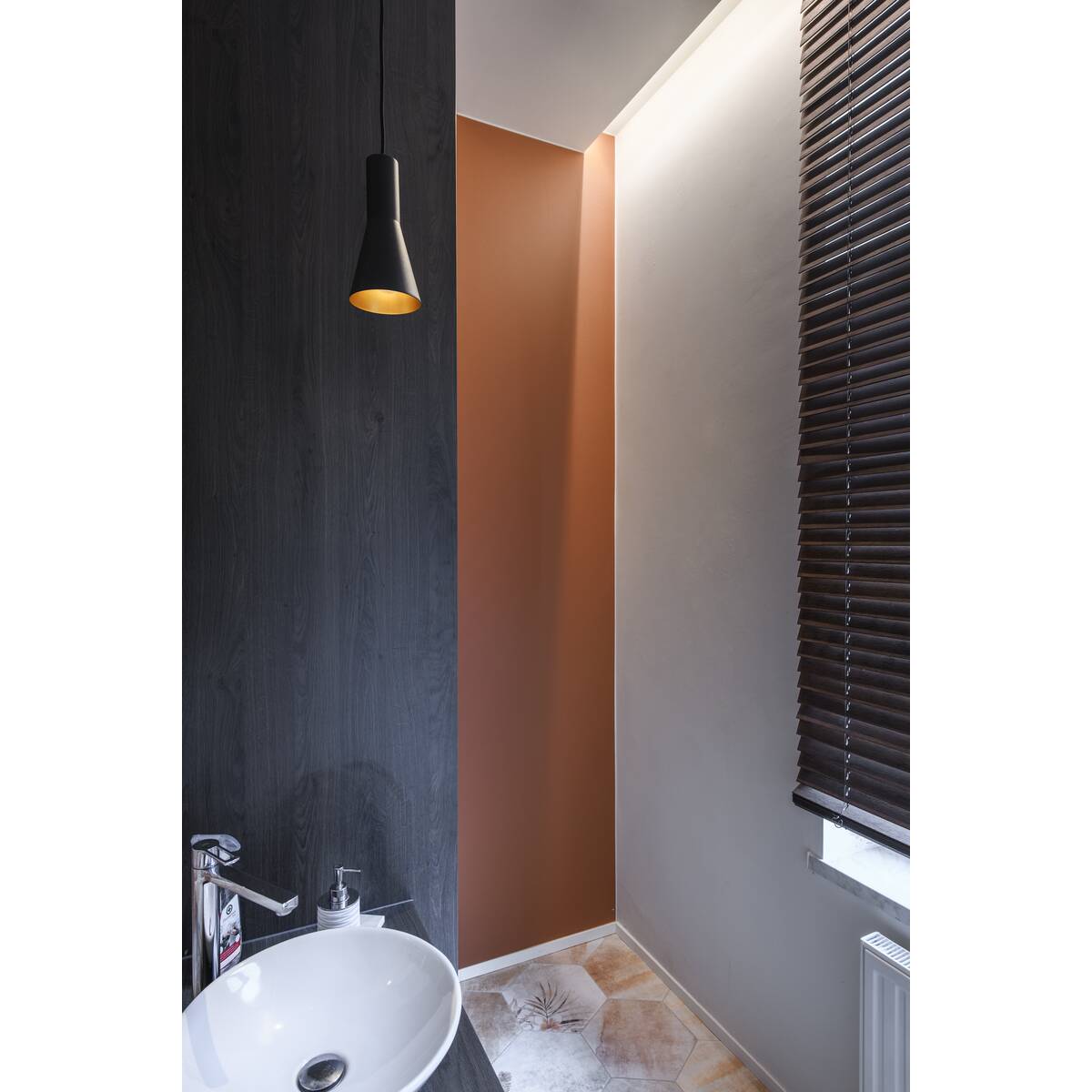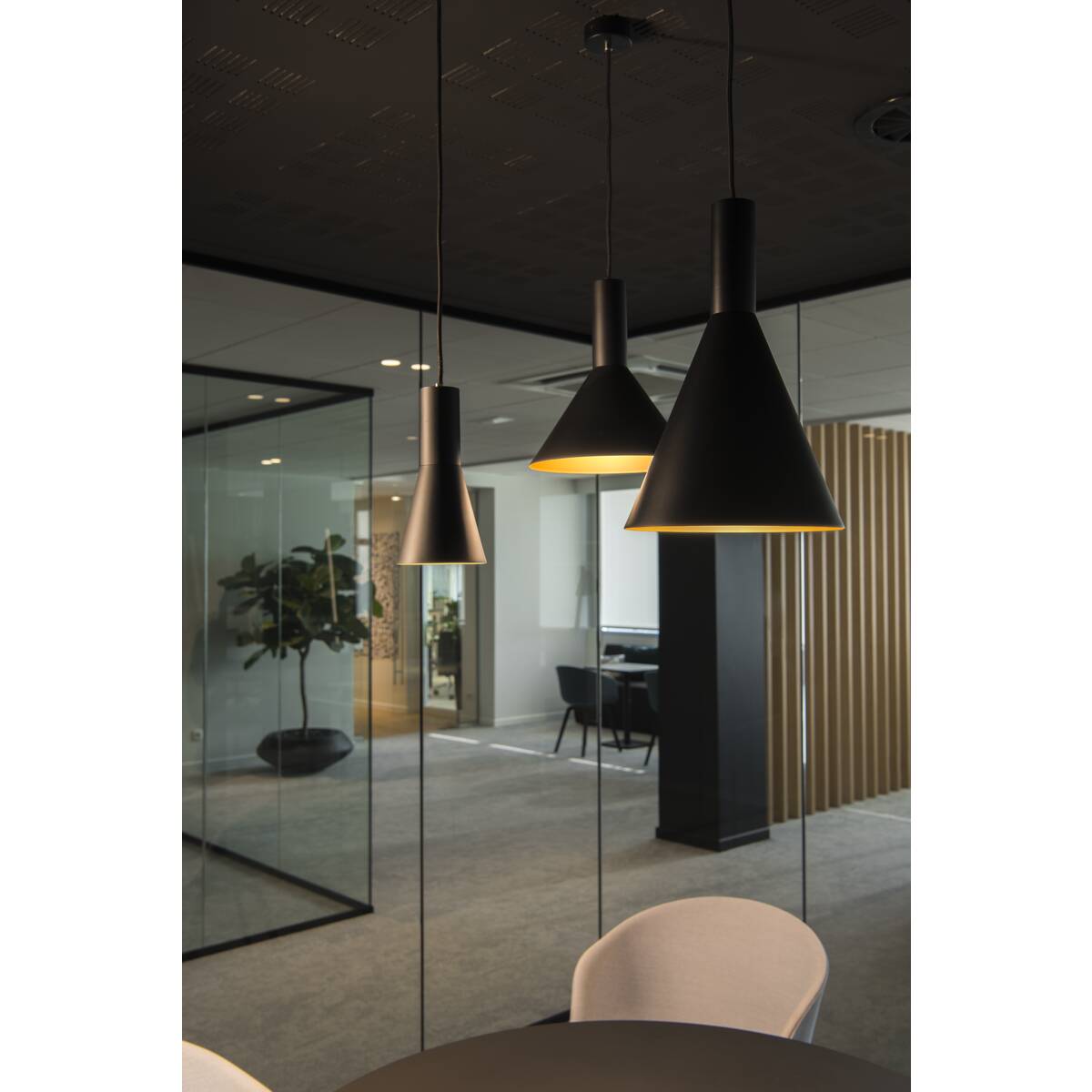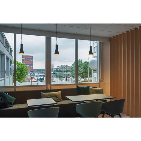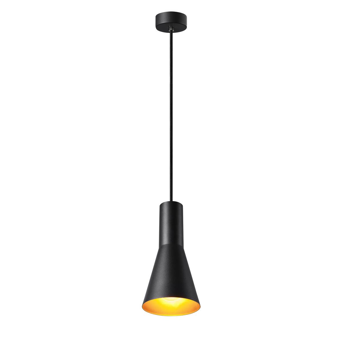 The conical shaped PHELIA high-voltage pendant offers an abundance of variations. The black and gold luminaire features a round ceiling plate. With its built-in E27 socket, the luminaire is suitable for both LED lamps and energy-saving lamps. The luminaire has a pendant length of 200 cm.