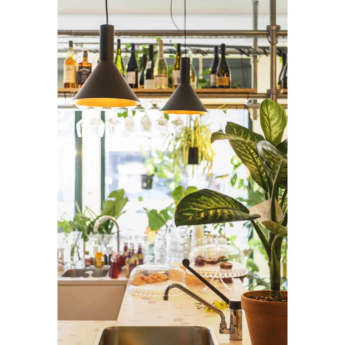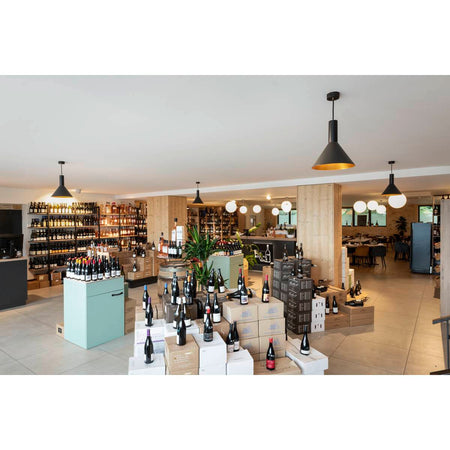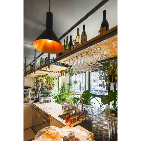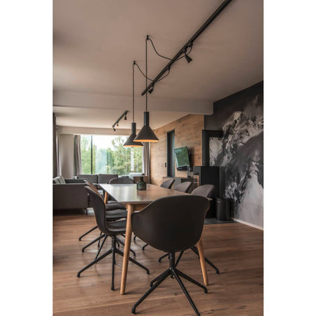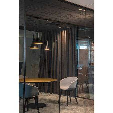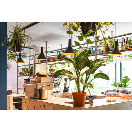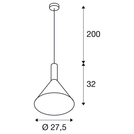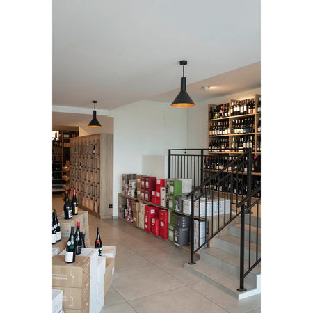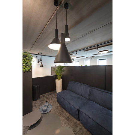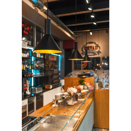 The conical shape of the high-voltage pendant lights in the PHELIA range offer a huge number of different options. These black/gold lights have a round ceiling rose. The integrated E27 base makes this light suitable for LED and energy-saving bulbs. The pendant length on the light is 200 cm.