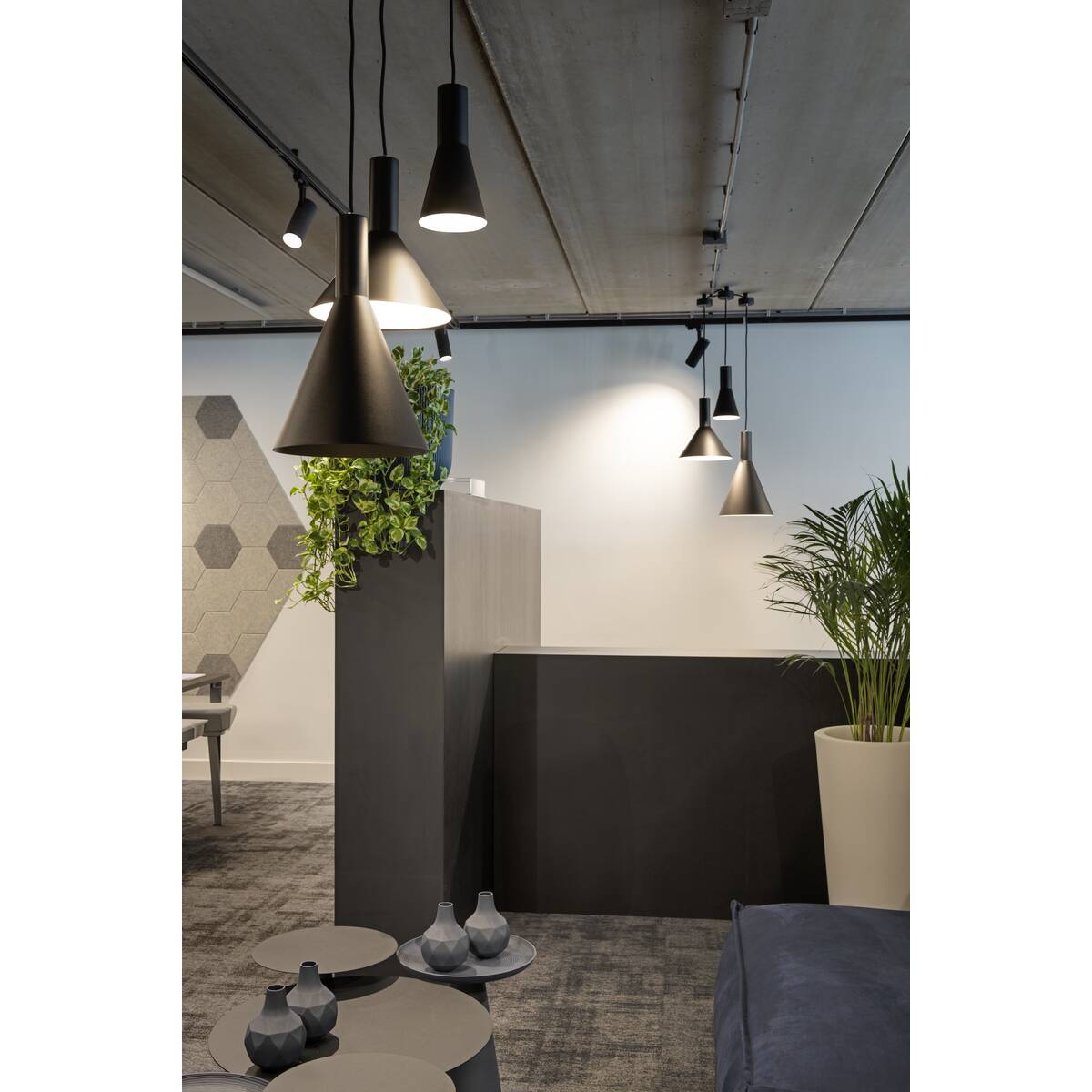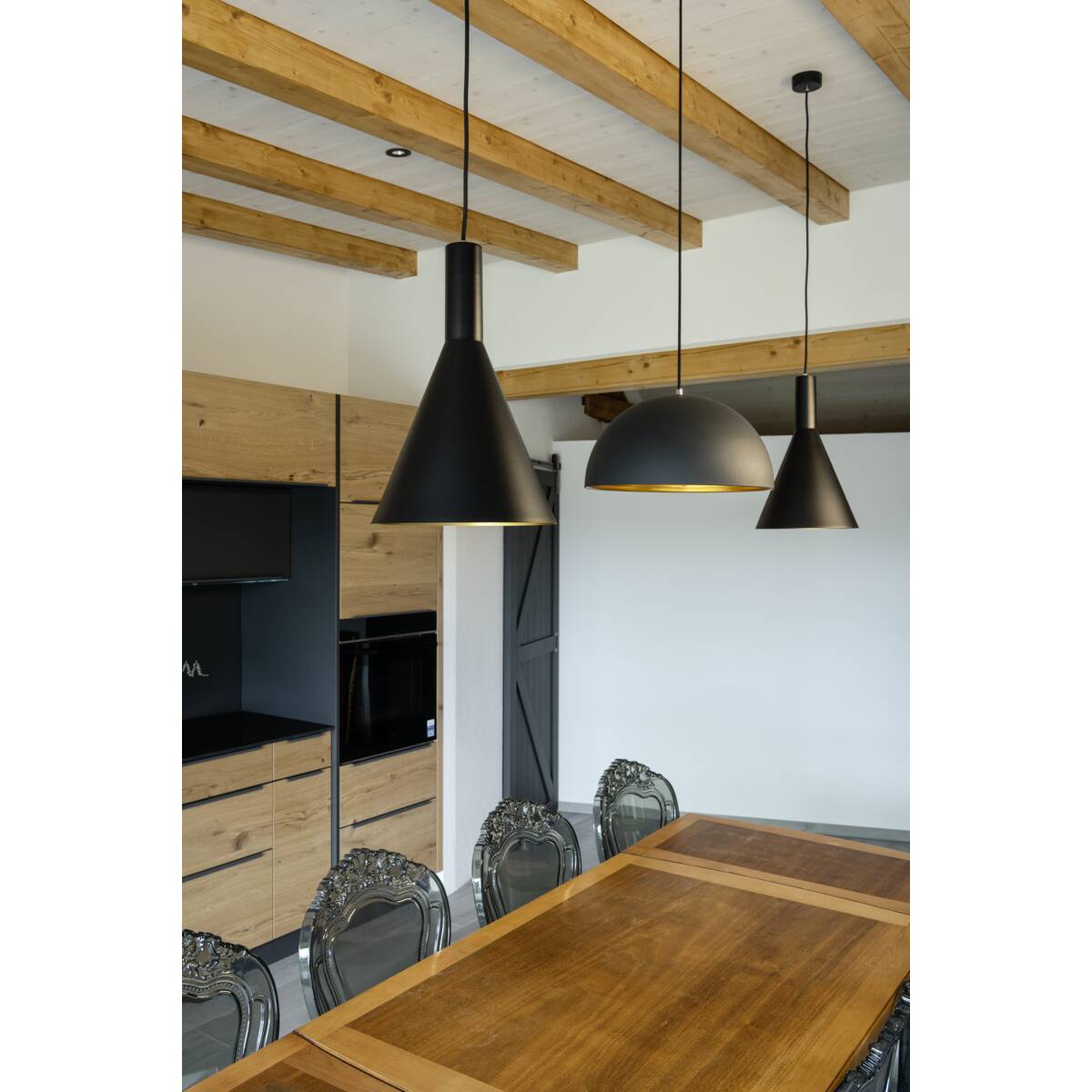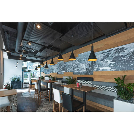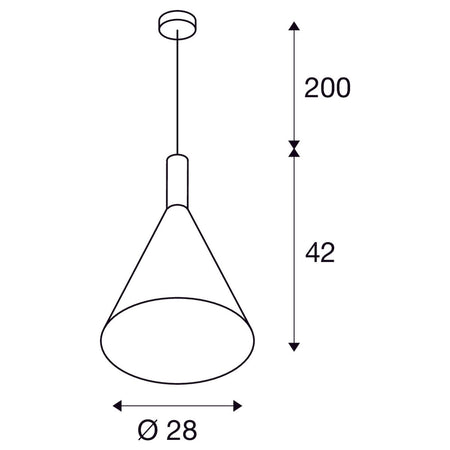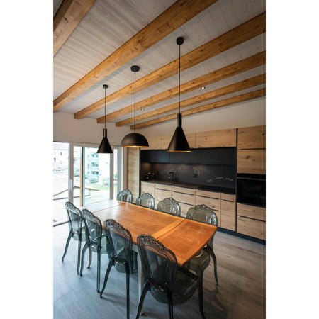 The conical shaped PHELIA high-voltage pendant offers an abundance of variations. The black and gold luminaire features a round ceiling plate. With its built-in E27 socket, the luminaire is suitable for both LED lamps and energy-saving lamps. The luminaire has a pendant length of 200 cm.