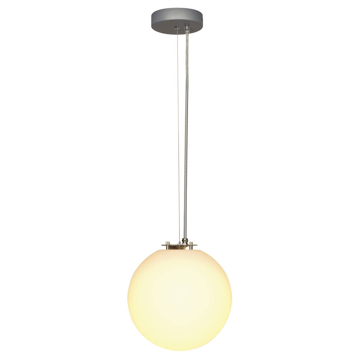 The spherical ROTOBALL 240V pendant features a lamp shade made of temperature resistant plastic, optically complimented by a silver grey, steel mounting bracket. The voluminous lamp shade, coupled with a standard E27 holder for energy-saving lamps or LEDs, provides even illumination characteristics. The package includes an appropriate ceiling plate. The ROTOBALL 25 pendant is thus ready for direct connection to the 230V mains supply.