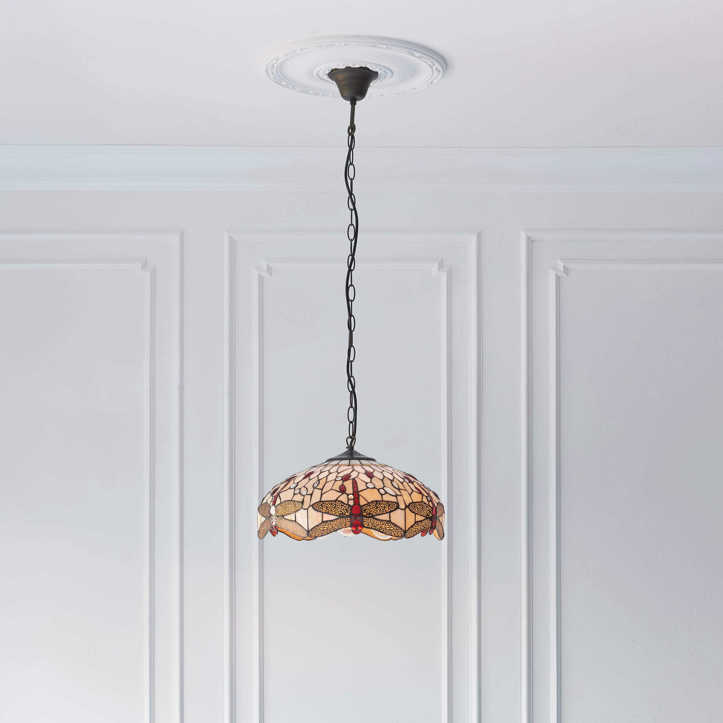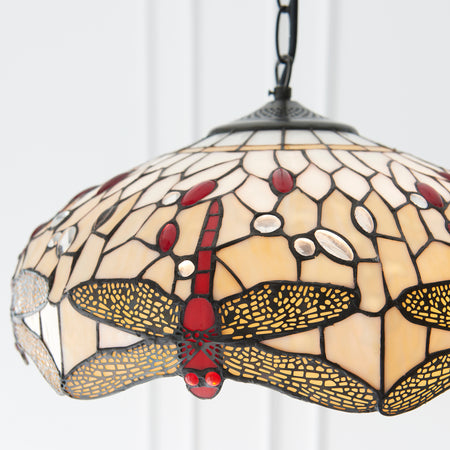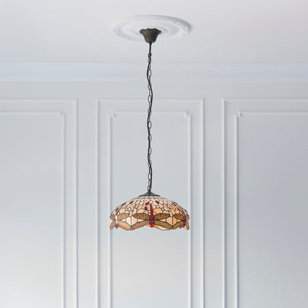 The medium Dragonfly pendant in beige is a traditional interpretation of the iconic Tiffany Dragonfly design, in natural muted colours with coloured glass beading and teamed with a satin black fitting. Compatible with LED lamps, dimmable and matching items available