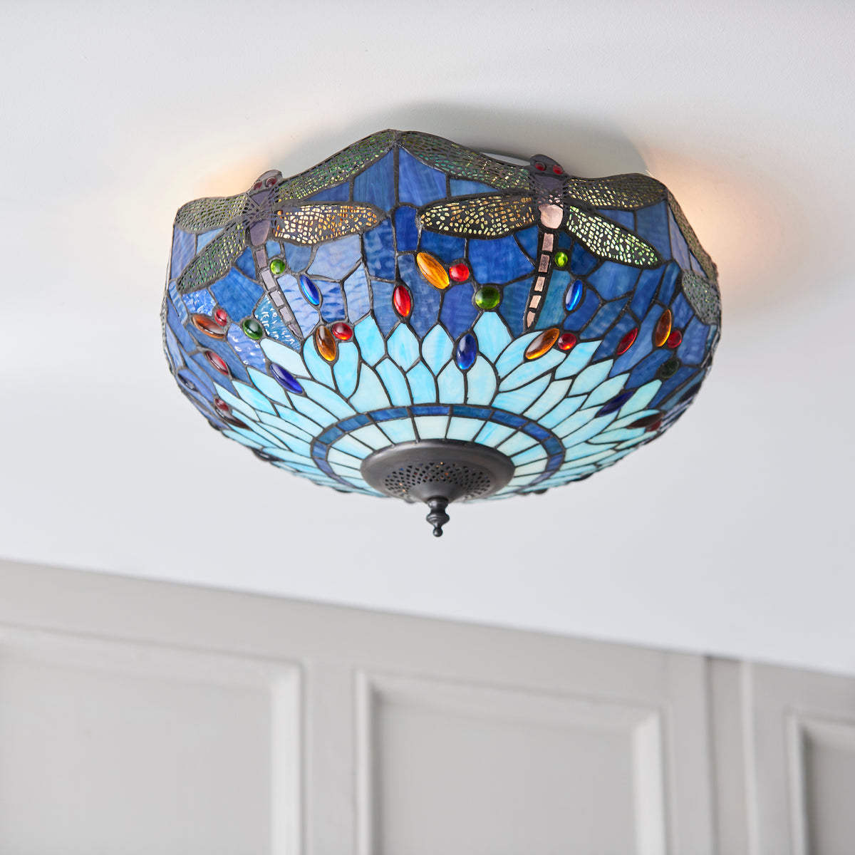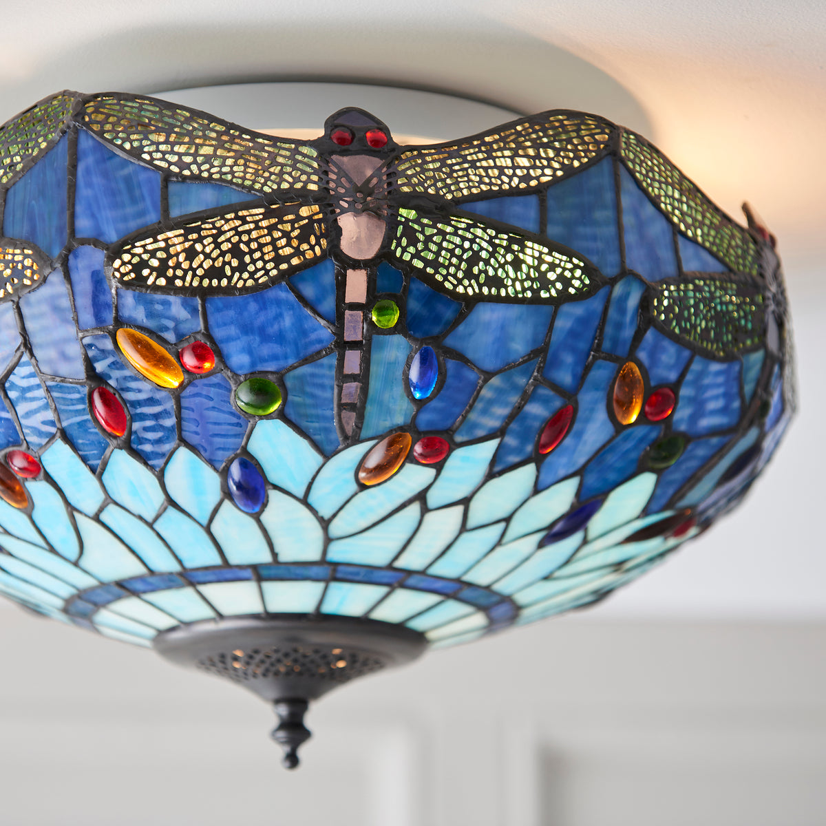 A stunning flush ceiling light with the iconic Tiffany Dragonfly design in a vivid blues with multi coloured glass beading. Teamed with a dark bronze effect fitting. Dimmable and compatible with LED lamps