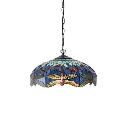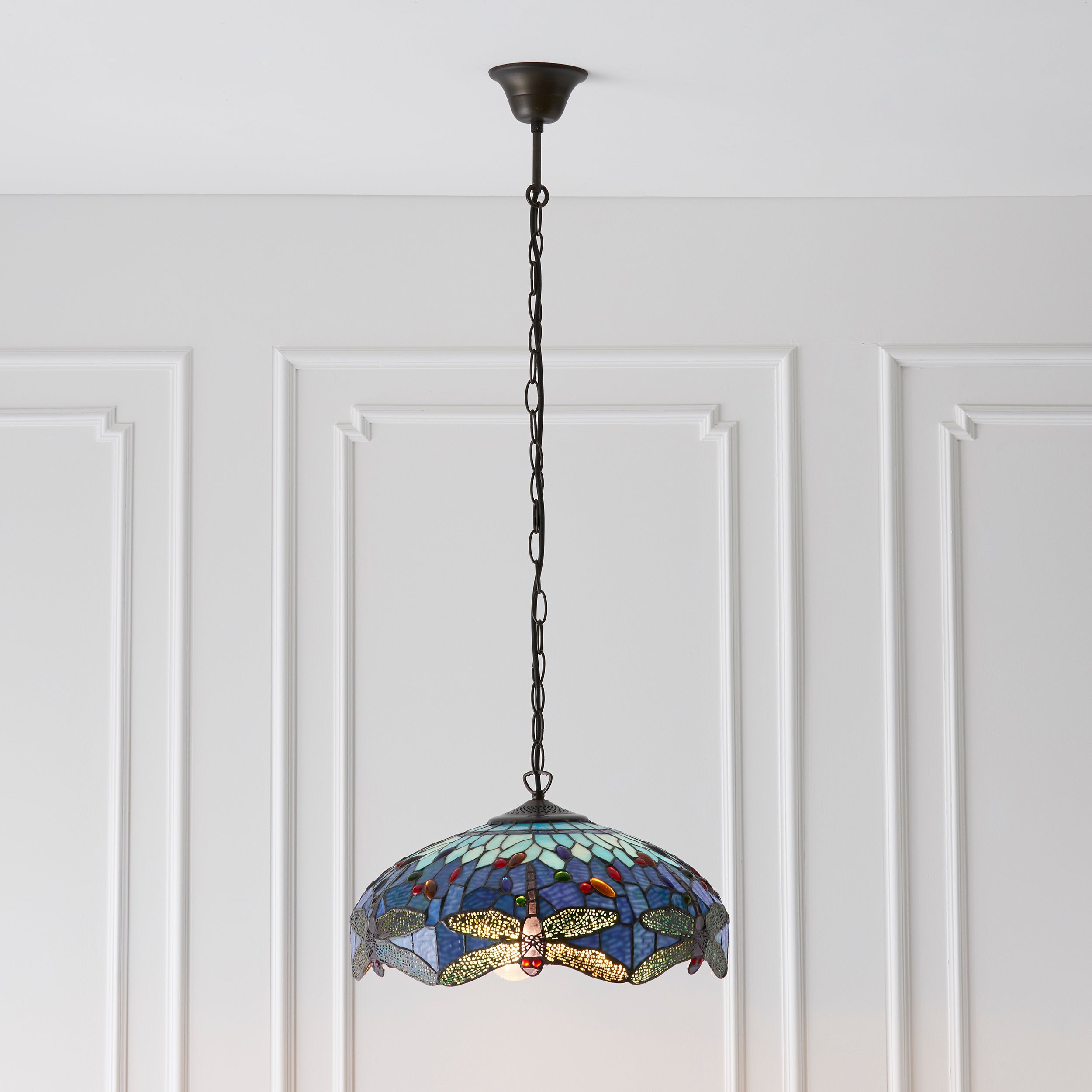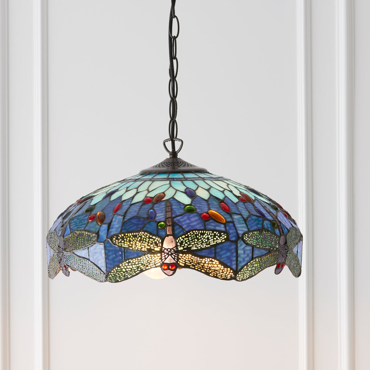 A stunning 3 light pendant with the iconic Tiffany Dragonfly design in a vivid blues with multi coloured glass beading. Teamed with a satin black fitting. Dimmable and compatible with LED lamps