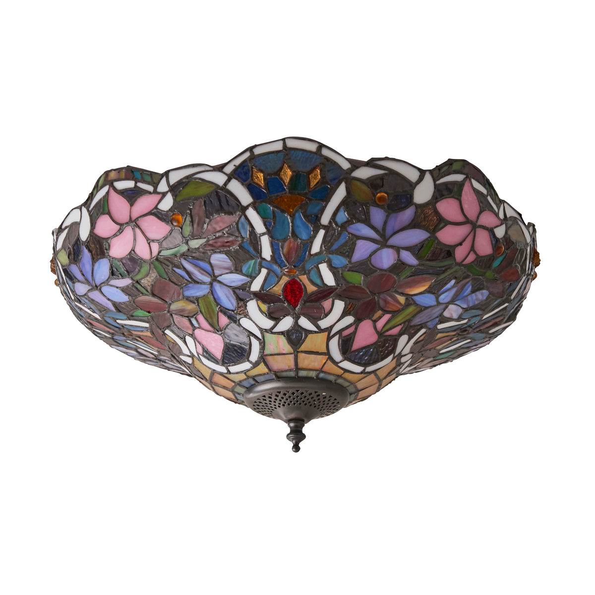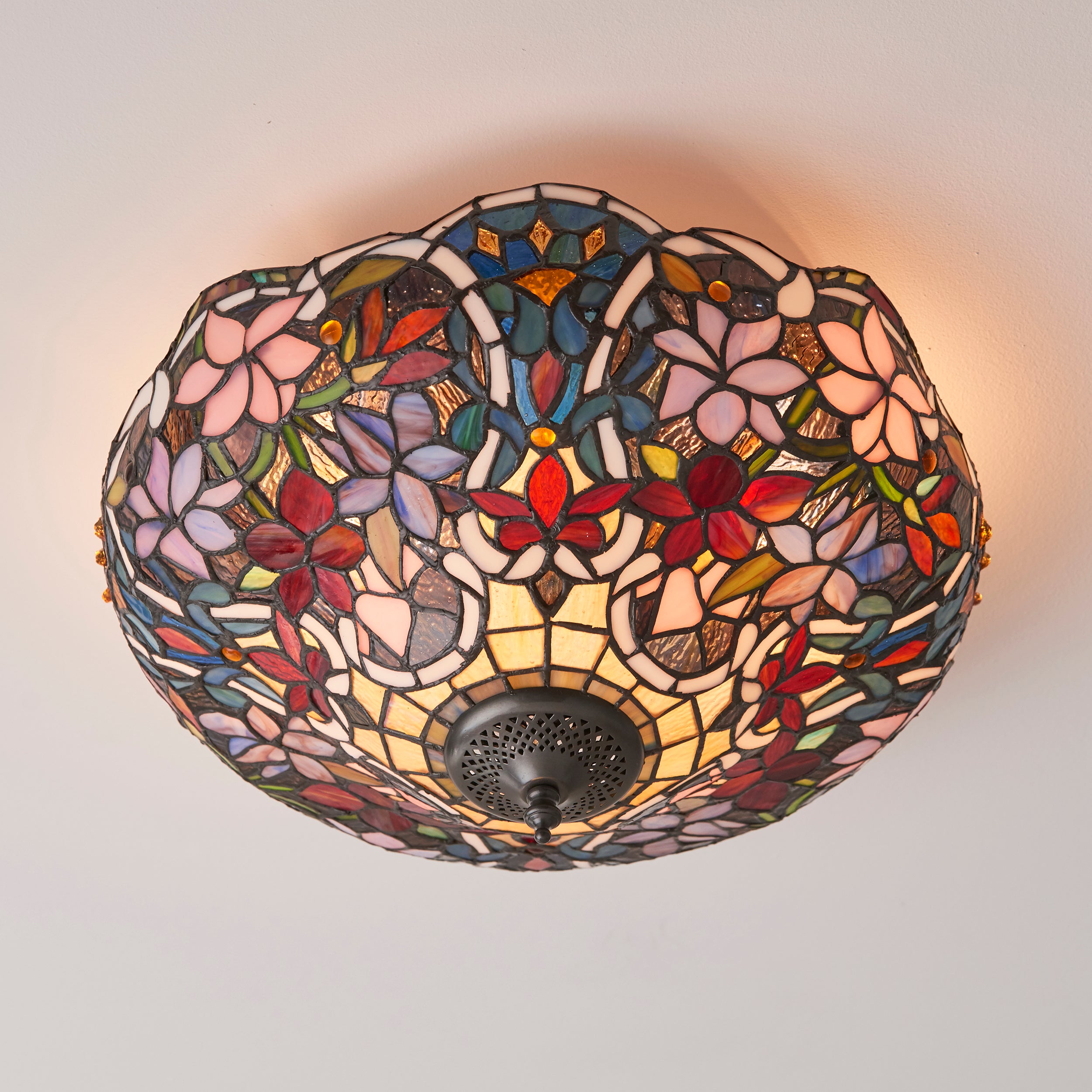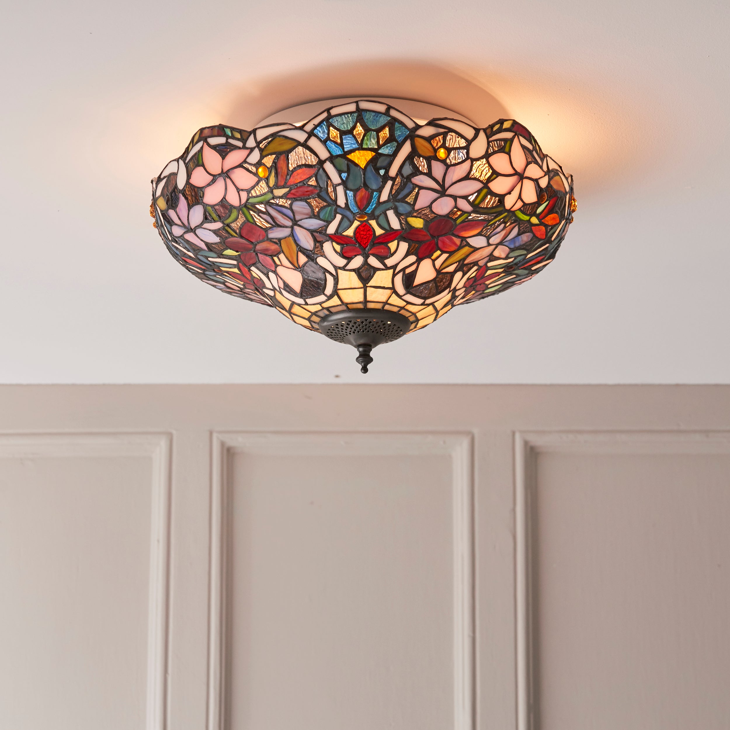 The Sullivan flush ceiling light is a richly coloured floral Tiffany design. Matching items available and compatible with LED lamps