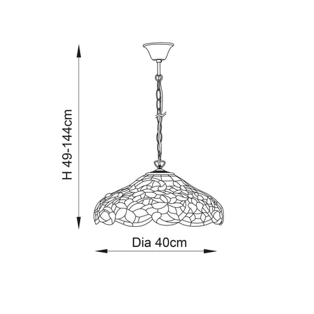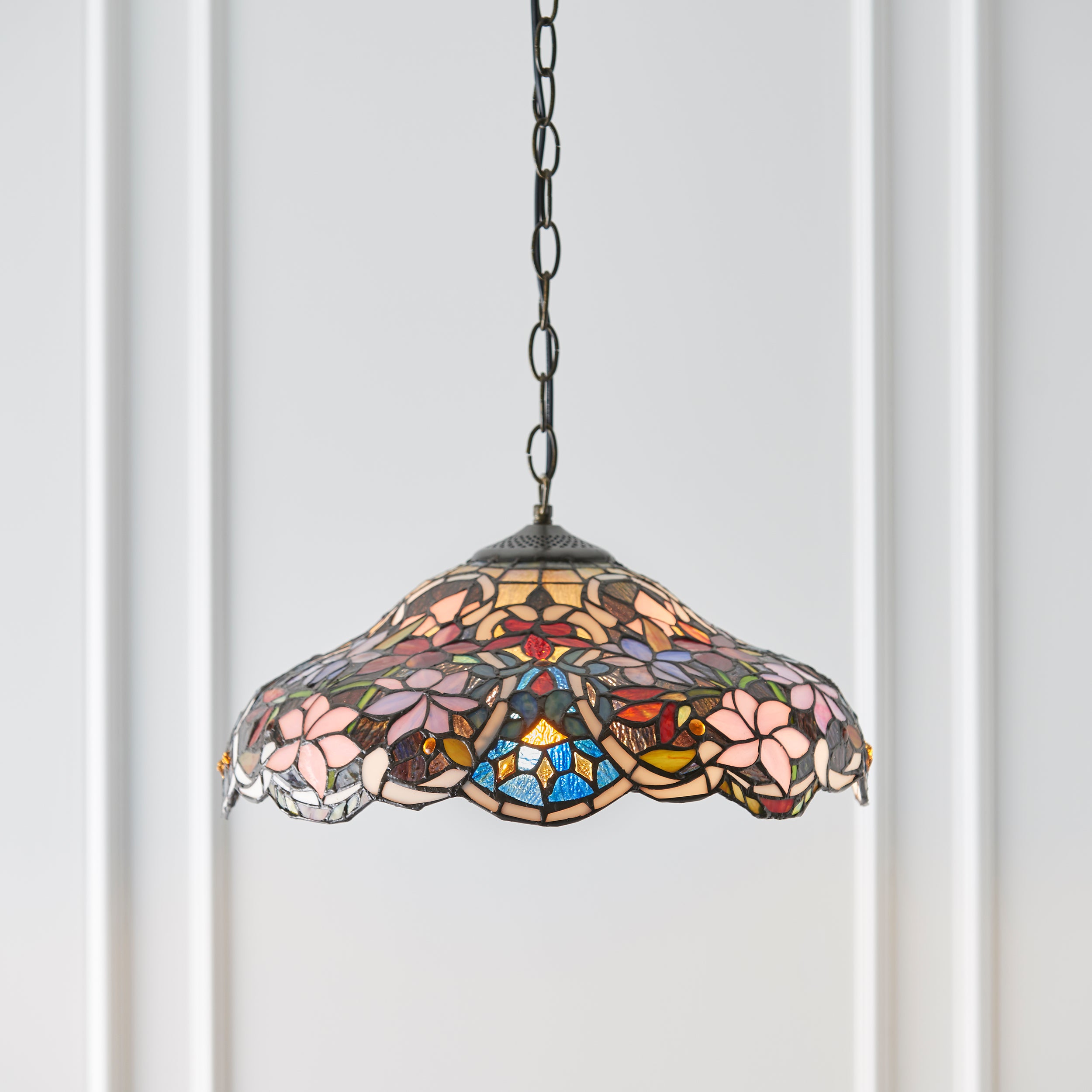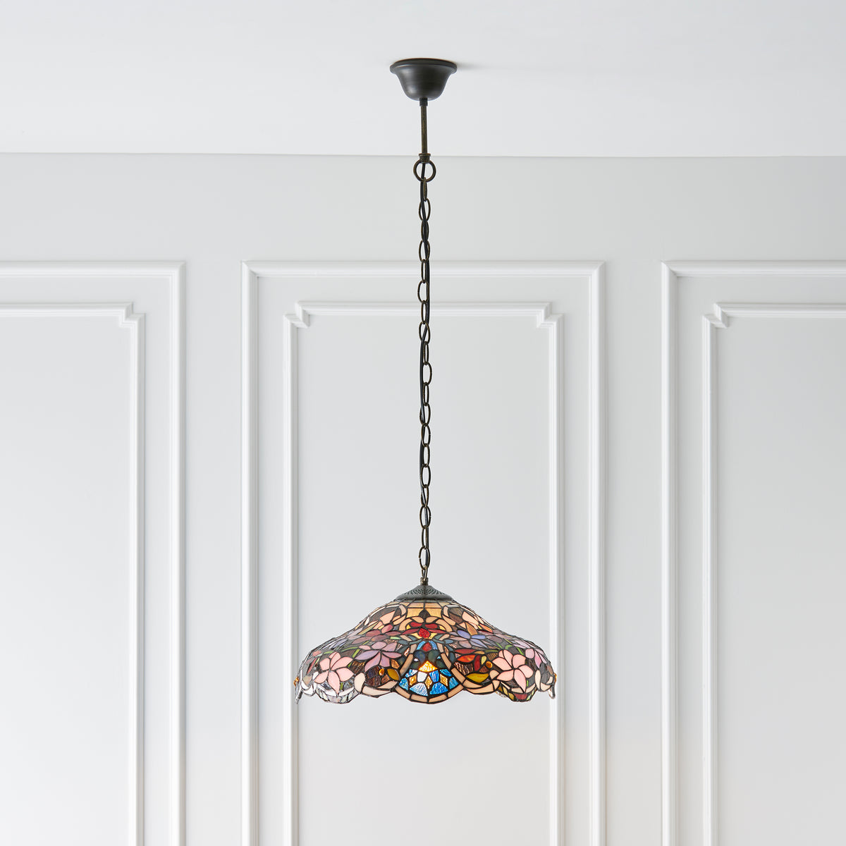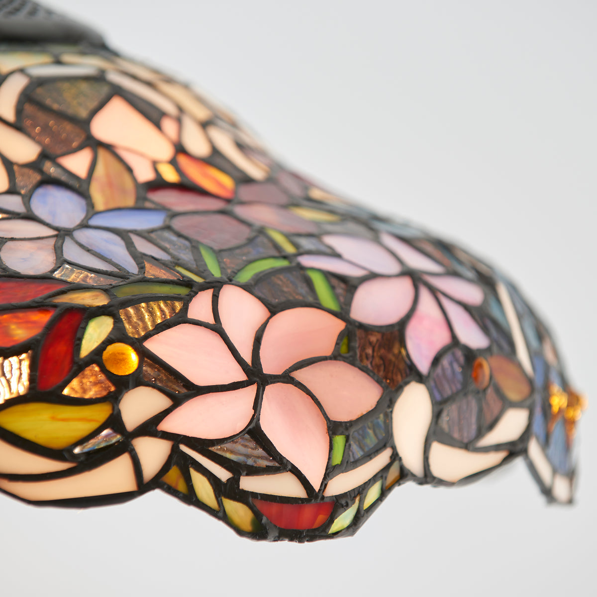 The Sullivan pendant is a richly coloured floral Tiffany design, teamed with a satin black fitting. Matching items available and compatible with LED lamps